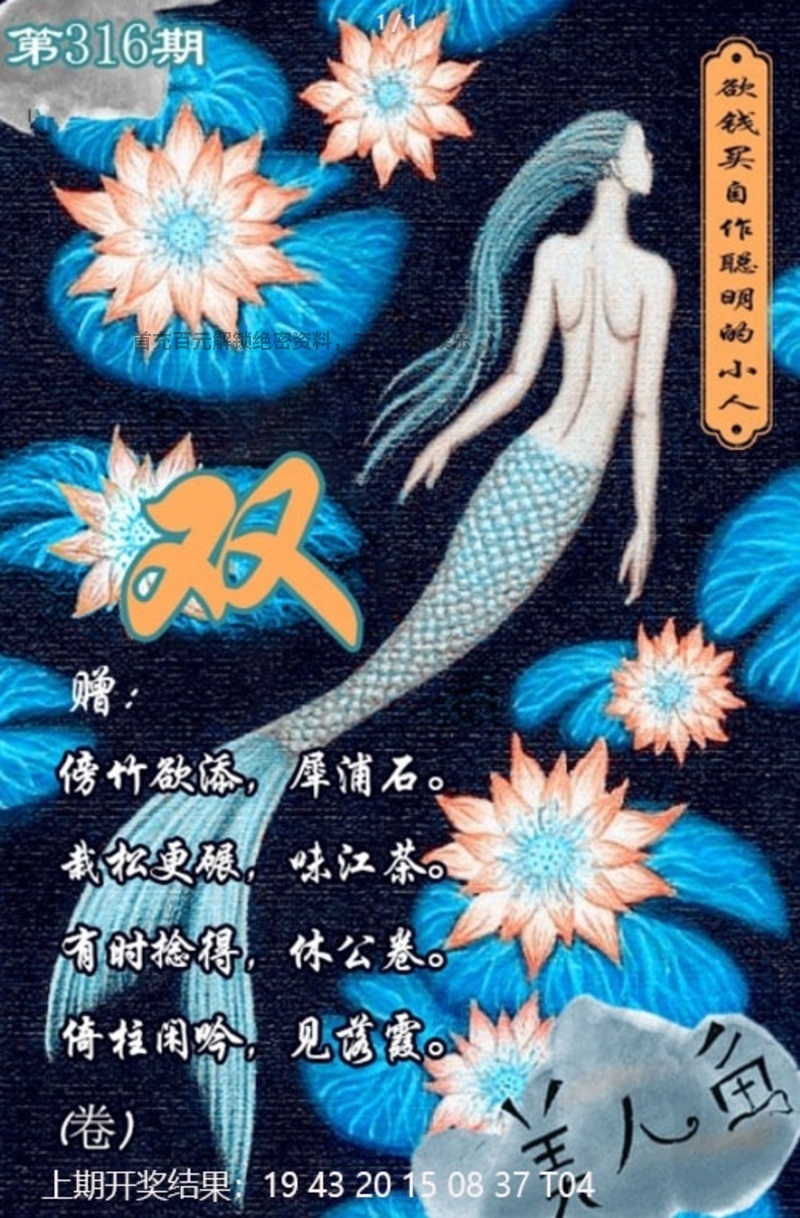 311期:美人鱼 解:回阵梁燕,引邻归。参阳丽景,亦若是。一饮一硕,犹自醉。春色匆勾,度柒句 综合:狗兔虎牛蛇鸡 |